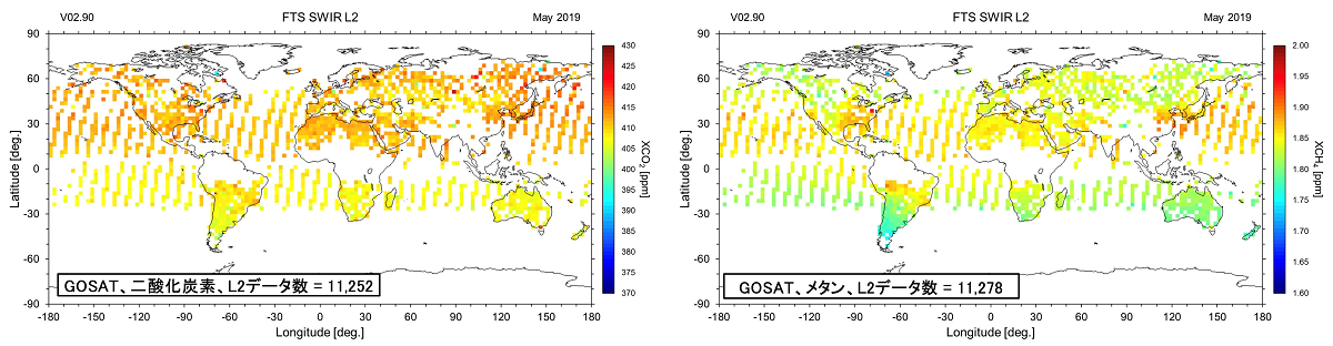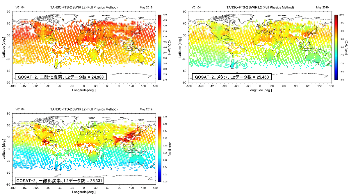 GOSAT-2 FTS-2データからフルフィジクス法で求めた2019年5月の二酸化炭素、メタン、一酸化炭素のカラム平均濃度の全球分布図を図1に示します。