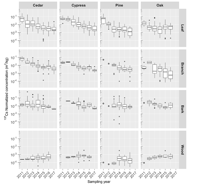 このような状況の中、私たちの研究グループは、国際原子力機関のプロジェクト(MODARIA II: Modelling and Data for Radiological Impact Assessments II)に加わり、福島原発事故から9年間の間に発表された、福島第一原子力発電所事故後に発表された学術論文、各種機関による報告書やウェブ上で公開されたモニタリングデータなどを海外の専門家とも協力して収集し、福島第一原発事故の影響下にある森林生態系の放射性物質動態の実態把握とその時間経過について取りまとめ、データベースを作成しました。この作成したデータベースについては一般公開を予定しています。また、その全容を、IAEAのIAEA技術報告書(IAEA-TecDoc)として報告しています。