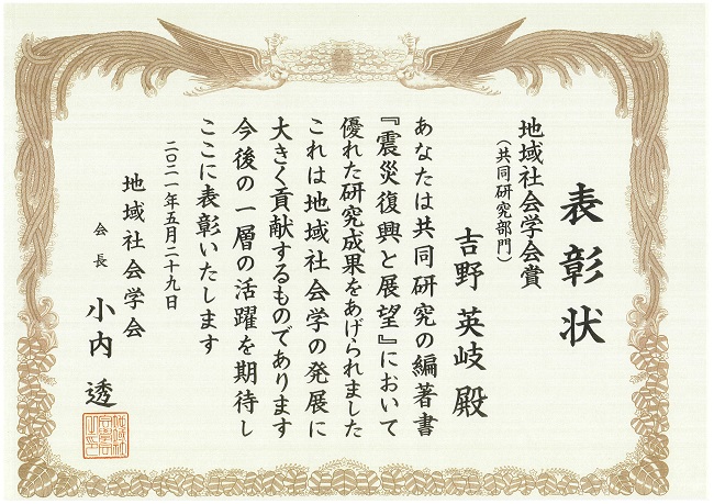 受賞対象: 女川町の復興と原発──原発と地域社会,吉野英岐・加藤眞義 編, 震災復興と展望——持続可能な地域社会をめざして(シリーズ 被災地から未来を考える(3)), 有斐閣, 212-248 ,2019