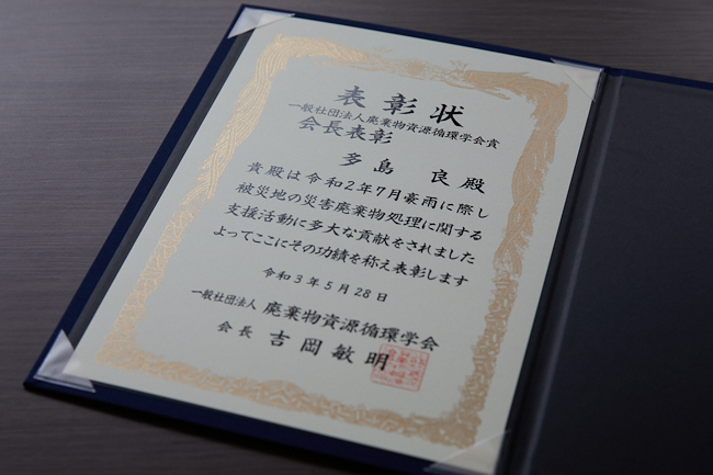 令和2年7月豪雨は主に熊本県内市町村において大きな被害をもたらし、大量の災害廃棄物が発生しました。廃棄物資源循環学会では、災害廃棄物処理の支援者のネットワークであるD.Waste-Netの一員として、現地派遣とオンラインによるサポートを組み合わせた支援を提供し、仮置場の現況把握、発生量推計、適正排出の呼びかけへの協力を行いました。こうした支援活動に対し、環境大臣より廃棄物資源循環学会へ感謝状が授与されたことを受け、支援活動の中心メンバーに対して会長表彰が贈られた次第です。被災現地では未だ災害廃棄物処理の途上にあります。引き続き、学術団体・研究機関として貢献できることを実践していきたいと思います。