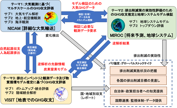本課題の特色として、テーマ間の連携を通じて様々な観測データ、モデル、統計情報を利用し、温室効果ガス収支の推定精度をこれまでよりも高めている点が挙げられます。