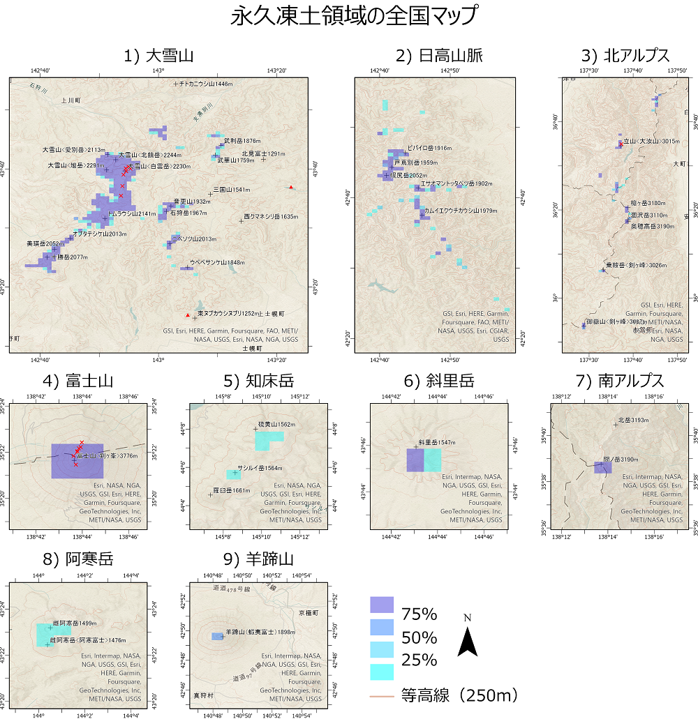 2年以上連続して0℃を下回る地中を永久凍土と呼び、主に北半球高緯度のツンドラ・タイガ域に広く分布しています [1]。全球的な永久凍土分布の南限に位置しているために、現在の日本では、緯度と標高の高い山の上の非常に寒冷な場所の、ごく限られた地点でしか、永久凍土の存在が確認されていません [2]。永久凍土の融解は地中の現象であるため、観測することが難しく、特に山岳地帯はアクセスが難しいこともあり、その全体像が把握されていないのです。これまでの研究では、ヨーロッパやチベット高原において永久凍土の現状評価や将来予測がなされてきましたが、日本を含む東アジア地域では、特に将来予測に関してはほとんど研究がなされてきませんでした。私たちの先行研究 [3] では、大雪山系での現状評価と将来予測を行いましたが、同様の解析を日本全域で行ったのが、今回の研究成果です。