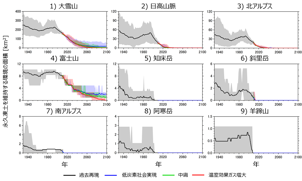 長期維持型は、比較的永久凍土領域が残る地域です。大雪山系や富士山は、永久凍土が存在できる現在の下限高度 [6] に比べて山頂標高が高いため、長期維持型に分類されます。とはいえ、大雪山や富士山でも、永久凍土領域は温室効果ガスの排出シナリオによらず将来大幅に減少します。将来の全球平均気温を安定化させる低炭素シナリオ(RCP2.6: 産業革命前に比べて全球平均気温上昇を2℃に安定化する)が実現した場合に、2100年時点でわずかにこの領域が残る(大雪山で10 km2程度、富士山で2 km2程度)ものの、他のシナリオでは21世紀後半にこの領域が消失する予測となりました。