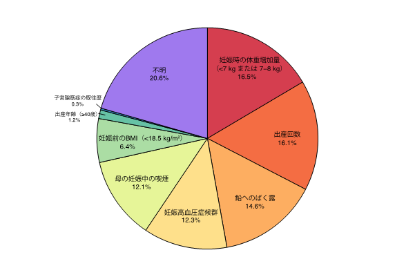 そこで、これまでエコチル調査で低出生体重と関連があると報告されたすべての要因について、それらが低出生体重の原因となる要因の寄与を示す人口寄与割合を算出しました。