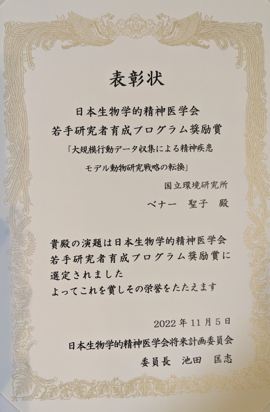 ベナー 聖子 主任研究員が日本生物学的精神医学会より第11回若手研究者育成プログラム奨励賞を受賞