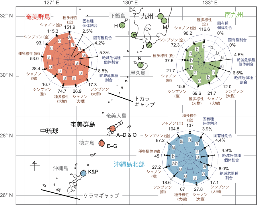 奄美群島に7区画、南九州に3区画、沖縄島北部に1区画の500 m2の調査区を設置し、定量的な植物相調査を行いました。そして、環境省モニタリングサイト1000プロジェクト1で提供されている5地点のデータと合わせて、地域間(奄美群島、沖縄島、南九州)の多様度2(種多様性、シンプソン指数、シャノン指数)と希少度(固有種の割合、絶滅危惧種の割合)を比較しました。