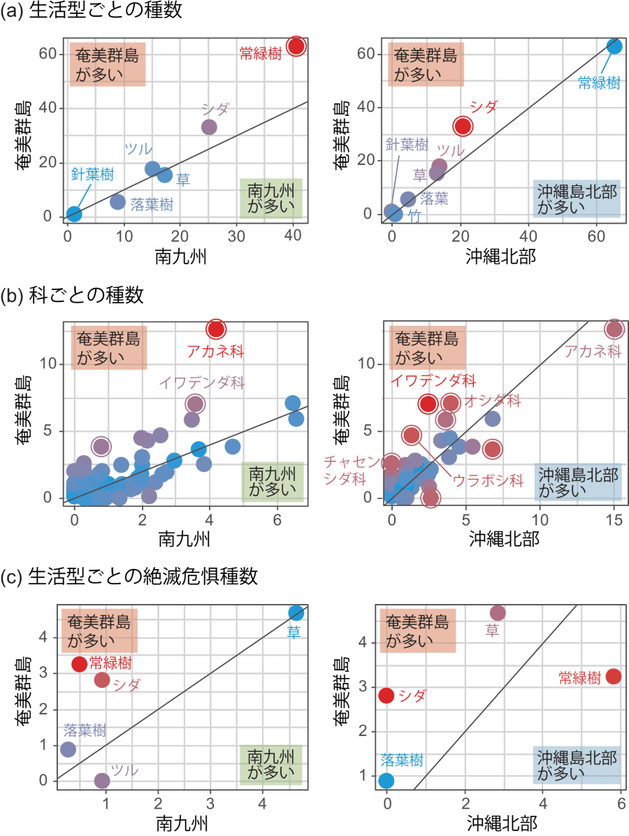 奄美群島(奄美大島・徳之島)の常緑広葉樹林は、沖縄島北部や南九州よりも高い種多様性を有する事が分かりました(図1)。そして、ほぼすべての多様度指数について、奄美群島は南九州よりも高い値を示しました。これは奄美群島の種数の高さは、個体数の少ない種が顕著に多いからではないことを示しています。奄美群島と南九州の種多様性の違いは、常緑広葉樹、特にアカネ科、モチノキ科の種多様性の違いによって生じていました(図2ab)。両科は熱帯・亜熱帯で高い多様性を示す分類群で、この結果は、新生代に広く分布していた熱帯気候が高い多様性を蓄積するための時間と機会を提供したというtropical conservatism仮説を支持します。また、奄美群島が沖縄島北部より高い種多様性を示す理由は、シダ植物、特にイワデンダ科、ウラボシ科、オシダ科、チャセンシダ科の種多様性が高いためでした(図2ab)。このように奄美群島の常緑広葉樹林は、周辺地域と比較すると常緑広葉樹とシダ植物の多様性が高いという特徴を持ち、地域間で共通する科において多様性に違いがあることが分かりました。さらに、絶滅危惧種に注目すると、奄美群島では、草本で最も種数が多く、次いで常緑広葉樹、シダ植物でした。(図2c)。