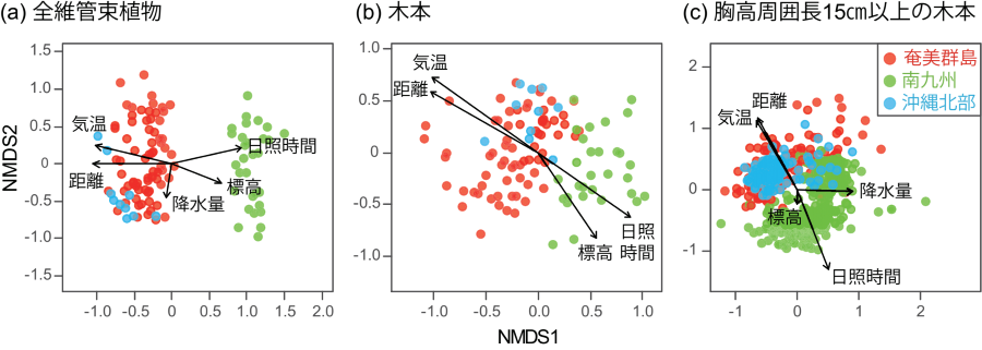 区画間の種組成の違いをMorisita-Horn非類似度指数により定量し、非計量多次元尺度法4により視覚化しました。視覚化された各区画の配置と環境要因との関連を明らかにするために並び替え検定を行い、有意な環境変数についてはベクトルで視覚化しました。環境変数は、各区画の日平均気温5、降水量5、日照時間5、標高、最も北に位置する区画からの距離を使いました。また、群集組成の違いに対する地史的分断(トカラギャップ、図1)の効果をnested PERMANOVA6で検定しました。