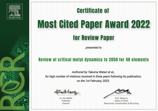 Resources, Conservation & Recycling誌に2020年に発表された論文の中から、出版年を含む2020-2023の3年間で最も多く引用された論文の一つとして"2022 Most Cited Paper Award"をいただきました。本論文では、エネルギー転換を支える金属資源の将来需給やその社会・環境影響に関する問題提起とともに、今後必要な研究の提言を行いました。本賞の受賞は、その重要性や危機感の高まりを反映していると感じています。