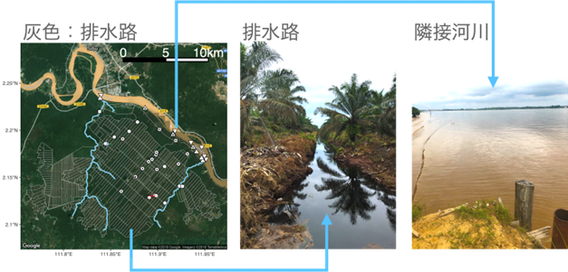今回の研究は、マレーシアのサラワク州にあるオイルパームプランテーションサイトを対象としました。本サイトは2000年に泥炭湿地林を開墾して作られました。本研究では、この地域に代表的な季節である雨季と乾季において排水路や排水が流れ込む隣接河川等(図1)から採水して、水質や溶存N2O濃度などの項目を測定しました。