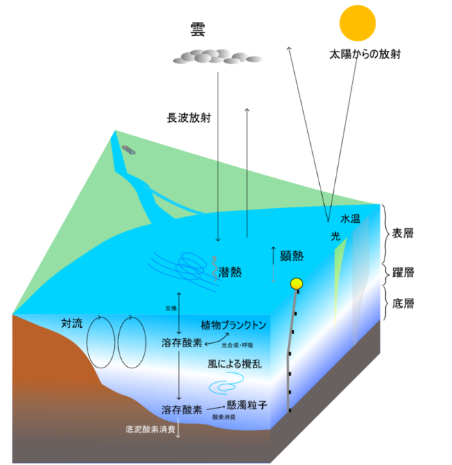 近年、気候変動の影響によって、夏季の猛暑の頻度が世界的に増加していることが報告されています。我が国においても、2022年の6月から7月にかけて例年にない猛暑が襲いました。湖では、水の表面が温められると、成層※1が発達し、湖面から湖底への酸素供給が滞ることで貧酸素水塊※2が発生することが知られています(図1)。貧酸素水塊が長期化すると、湖底堆積物から栄養塩が溶出しアオコの発生につながる恐れや、湖底付近に生息する魚類や二枚貝の斃死(突然死)が起こる可能性があります。