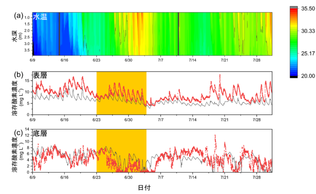 浅い湖沼では、日中に成層が発達し、夜間に混じる日成層という現象が発生します。また、風によって表層水と底層水が混じりやすいため、湖底にも酸素が比較的届きやすい状態と言えます。しかし、近年世界的に増加している猛暑による、底層の酸素濃度減少への影響はわかっていませんでした。そこで本研究では、霞ヶ浦を対象にし、2022年6月から7月にかけて発生した猛暑が、湖の貧酸素化にどの程度影響を与えたかを明らかにすることを目的としました。