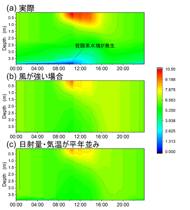 2022年6月から7月に発生した猛暑では、底層溶存酸素濃度が2 mg/L以下の貧酸素水塊が発生していました(図2)。シミュレーションを行った結果、猛暑が発生した際に風が弱かったことで底層溶存酸素濃度が低下したことがわかりました(図3a)。風速を約1.5倍にし、シミュレーションを行ったところ、貧酸素水塊が解消することが明らかになりました(図3b)。また、日射や気温が平年並み(日射–31%,気温–17%)であった場合には、風が弱かったとしても、底泥による酸素消費が抑制され、貧酸素水塊は発生しないことが明らかになりました(図3c)。つまり、夏季の猛暑が発生した際には、強い日射や高い気温によって水温が上昇し、生物的または化学的なプロセスによって底質の溶存酸素消費が活発になることに加え、弱風によって底層への酸素供給が滞ることで底層溶存酸素の濃度低下が促進されるものと考えられました。