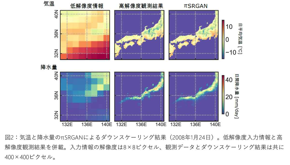 ●地球規模の気候シミュレーションから出力される1ピクセル100km四方程度の低解像度データから、1ピクセル2km四方程度の高解像度データを得ることが可能な、50倍の詳細化を実現する機械学習によるダウンスケーリング手法を開発した。 ●観測に基づくデータとの比較により、地点毎の統計量だけではなく、離れた地点間で生じる気候現象の時間変化の相関関係を、従来に比べ3倍以上の精度で得られることを示した。 ●本技術は、地球温暖化による気候変動が、交通インフラや再生可能エネルギーなど空間的広がりを持つネットワーク構築に及ぼす影響を正しく評価するために重要である。