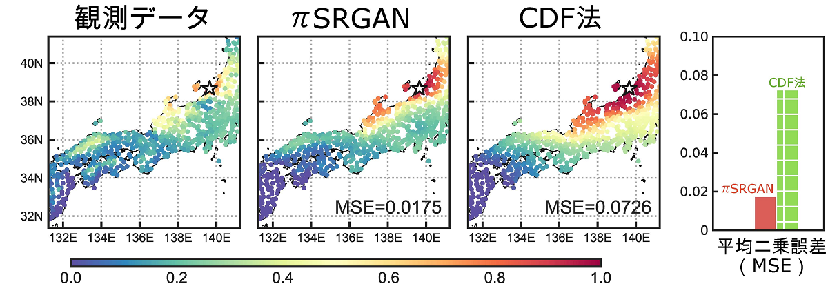 CDF法は地点別には統計量を精度よく再現するものの、離れた地点間の気候情報の時間変化が実際より強く関係づけられてしまう(例えば、ある地点が雨であったとき、現実よりも離れた地点でも雨と判定しやすい。)という問題が指摘されていました。図3は、πSRGANでこの問題が解消されるかを検証した結果です。新潟を基準地点として、各地点との降水量の相関の強さを示す量の分布を示しています。CDF法では相関の強さが新潟から離れるに従って単調に減少しているのに対し、πSRGANでは観測データがもつ非単調で複雑な空間分布パターンがよく再現できています。観測との誤差を比較すると、精度向上は3倍以上になります。