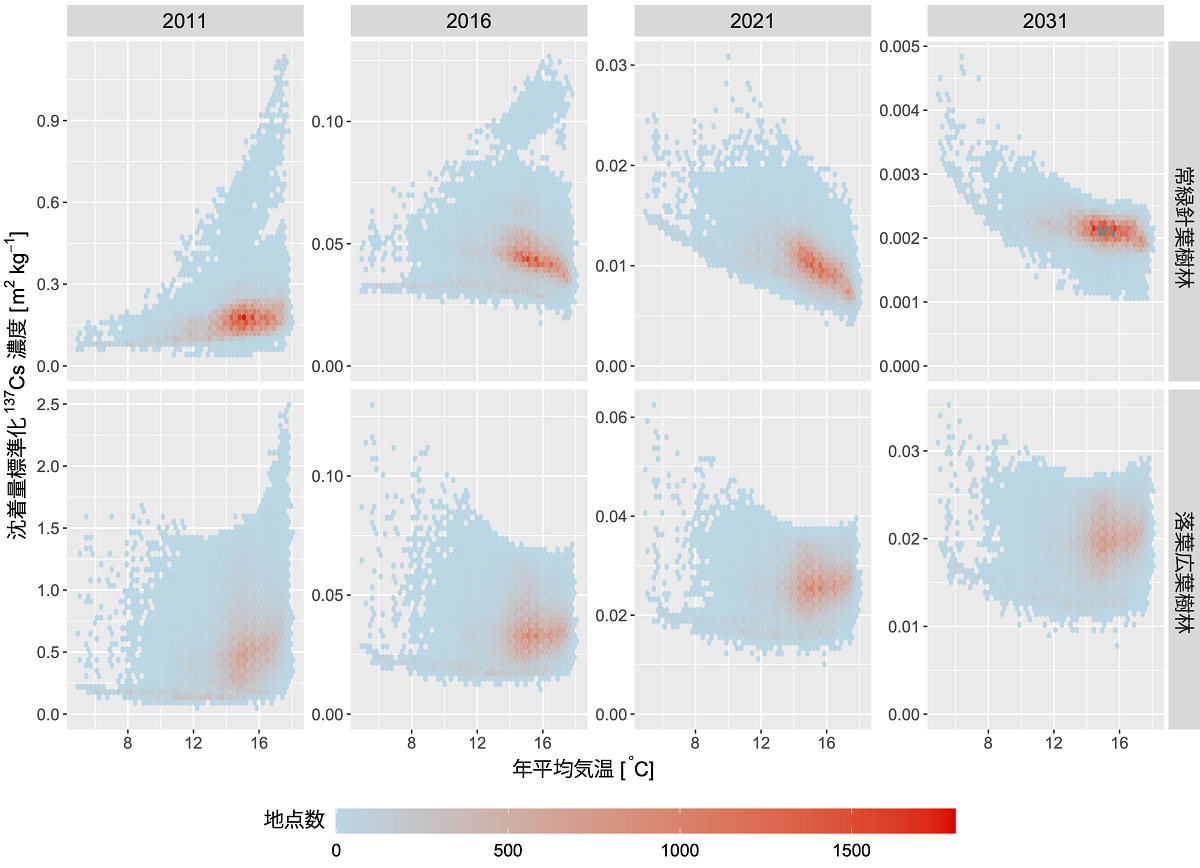 林床有機物層の汚染状況の地理的分布には事故直後の137Csの沈着量が最も影響していますが、植生タイプ(常緑針葉樹林か落葉広葉樹林か)や年平均気温の違いがその後の経時変化に大きな影響を与えていることが明らかになりました。今回の研究結果は、広域かつ長期にわたり放射能汚染された森林や流域の生態系を管理していく上では、137Csの初期沈着量の多寡だけでなく標高や植生分布の違いも考慮し、137Cs汚染源のホットスポットになる可能性がある地域がどのように変化していくかを明らかにしていくことが重要であることを示唆しています。