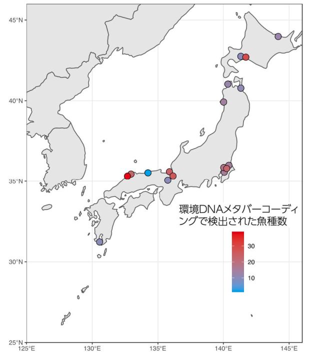 その結果、魚類の種数について、最大で40種が確認され、特に汽水湖である宍道湖や古代湖である琵琶湖などの湖沼での多様性が高く、また、北海道など緯度が高いところでは多様性が低い傾向が見られました。