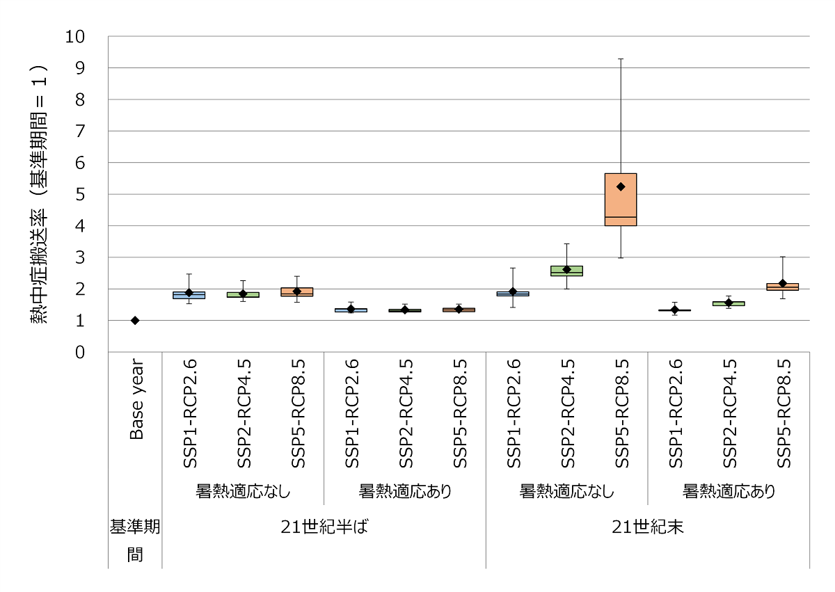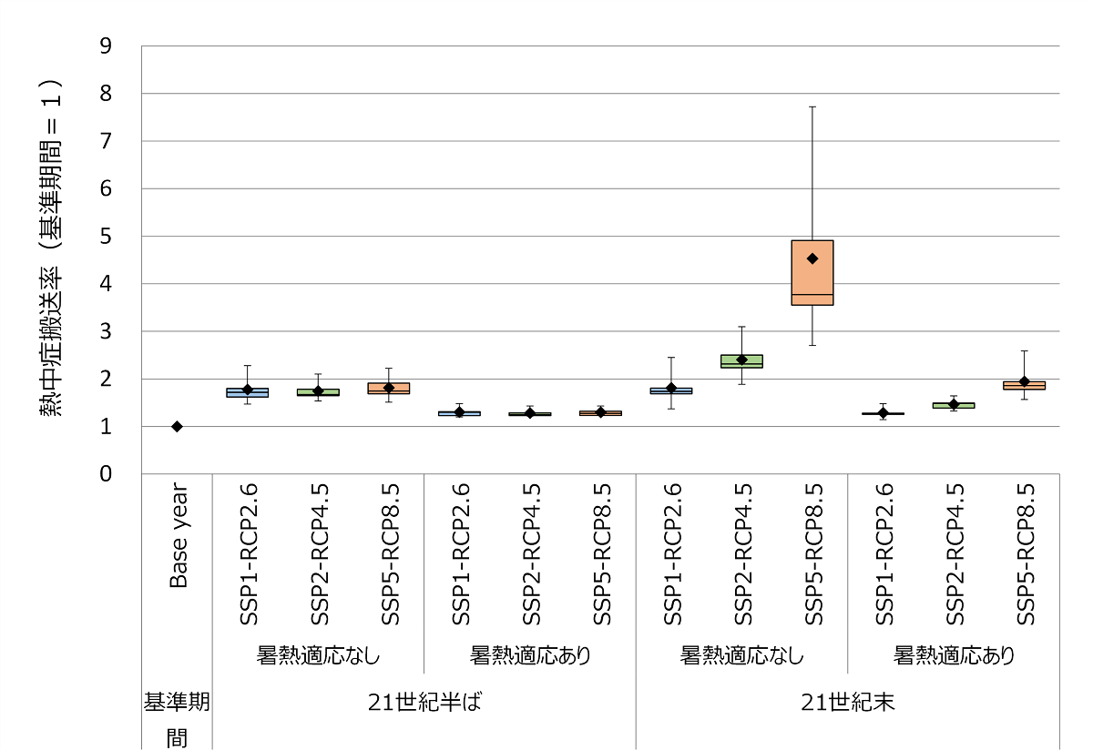 また、考慮しない場合、21世紀末には7歳から17歳で2.92倍、18歳から64歳で3.66倍、65歳以上で3.26倍に、考慮した場合、それぞれ1.57倍、1.77倍、1.69倍に増加すると予測されました(図2)。長期的な暑熱適応を考慮しても、気候変動の進行により、現在より搬送率が増加すると予測され、更なる熱中症対策の必要性が示唆されました。