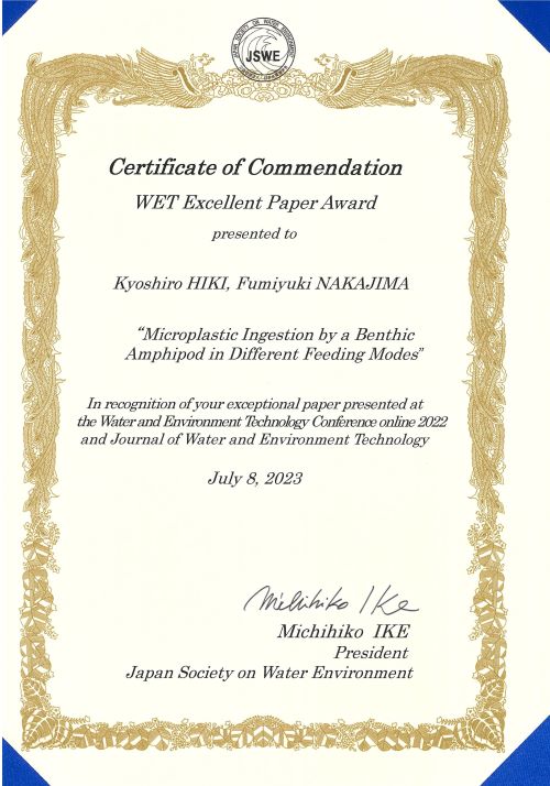 受賞対象: Microplastic ingestion by a benthic amphipod in different feeding modes, Journal of Water and Environmental Technology, 20 (5), 2022
