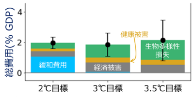 一方で、本研究では2015年ごろの知見に基づき将来にわたる緩和費用を想定していますが、近年の技術革新と普及拡大に伴い緩和費用も急激に低下しており、そうした傾向がさらに進めば、2℃目標や1.5℃目標といったより温暖化レベルが低い場合に気候変動の総費用が最小になり得ると考えられます。ただし、急激な緩和策に伴う社会変革が及ぼすモノやサービスの需給変容によって職を失う人や土地被覆や土地利用の改変が生物多様性の損失や食料供給リスクに及ぼす影響については十分に考慮されていない点にも留意する必要があります。