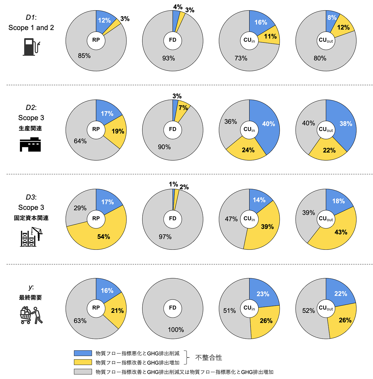 全体的に、不整合(図2の青色と黄色)の割合が大きい指標は、資源生産性(RP)や循環利用率(CUin,CUout)であることが確認できます。黄色の不整合の割合は、経済的要因の変化が物質フローを改善させたがGHG排出量の増加を招いた産業の割合であり、資源生産性(RP)では最大で50%を超えています。つまり、これらの物質フロー指標を向上させる各産業の経済的要因の変化が必ずしもGHG排出の削減を同時にもたらすとは限りません。この資源生産性(RP)と循環利用率(CUin,CUout)における不整合性の割合は、Scope1 and 2では比較的小さく、すべての指標で30%未満です。一方で、Scope3は、「D2:生産関連」と「D3:固定資本関連」の2種類ともに不整合の比率が高く、30%から70%の産業部門が該当します。特に、循環利用率(CUin、CUout)の不整合性は50%を超えています。中でも、Scope3のD3は不整合性が高く、固定資本形成に伴う物質消費の抑制とGHGの排出削減を同時に達成することが、将来の脱炭素社会に向けた物質フロー管理において優先すべき課題であると言えます。例えば、既存の機器や設備、建造物等を最大限に活用し、固定資本形成に必要となる鉄鋼やセメント、ガラス等の製造時に多くのGHGを排出する物質の消費を抑えることが重要になります。