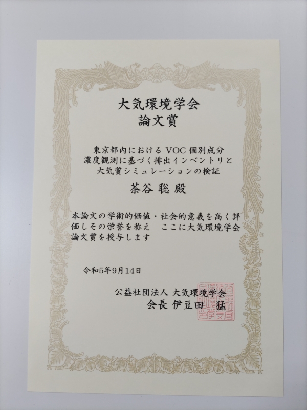 受賞対象: 東京都内におけるVOC個別成分濃度観測に基づく排出インベントリと大気質シミュレーションの検証, 大気環境学会誌, 57 (2), 35-52, 2022. https://doi.org/10.11298/taiki.57.35
