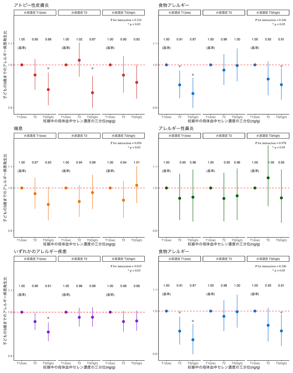 調査の結果、出生前の水銀ばく露およびマンガンばく露と3歳までの子どものアレルギー疾患の発生との間には、関連は見られませんでした。しかしながら出生前のセレンばく露に関して、母体血中濃度を対数変換して2倍増えるごとの発生比を算出した結果、アトピー性皮膚炎(CIR=0.73、95%CI: 0.65–0.83)、食物アレルギー(CIR=0.81、95%CI: 0.72–0.90)、アレルギー性鼻炎(CIR=0.82、95%CI: 0.68–0.98)、アトピー性皮膚炎、食物アレルギー、喘息、アレルギー性鼻炎のいずれかのアレルギー疾患(CIR=0.85、95%CI: 0.80-0.91)の発生リスクが低いことが示されました(図1)。また、各金属元素濃度を低い濃度から高い濃度まで順に並べて人数が均等になるように5つのグループに分け、それぞれのアレルギー疾患発生リスクを確認したところ、セレンばく露に関して、最も濃度が低いグループに比べて最も濃度が高いグループで発生リスクが低く、アトピー性皮膚炎、食物アレルギー、アレルギー性鼻炎、いずれかのアレルギー疾患で直線的に発症リスクが低くなる傾向が確認されました(図2)。さらに、水銀濃度を低い濃度から高い濃度まで順に並べて人数が均等になるように3つのグループに分けてセレン濃度とアレルギー疾患の発生との関連を検討したところ、水銀濃度が最も低い場合には、セレン濃度とアトピー性皮膚炎(CIR=0.88、95%CI: 0.81–0.96)、食物アレルギー(CIR=0.87、95%CI: 0.80–0.94)、アトピー性皮膚炎、食物アレルギー、喘息、アレルギー性鼻炎のいずれかのアレルギー疾患(IR=0.91、95%CI: 0.87–0.95)の発生との間に負の関連が見られましたが、水銀濃度が高い場合にはセレン濃度といずれかのアレルギー疾患の発生との間には関連は見られませんでした(図3)。子どものアレルギー疾患に関して、水銀濃度とセレン濃度との間に交互作用※7が認められました(交互作用のP=0.015)(図3)。