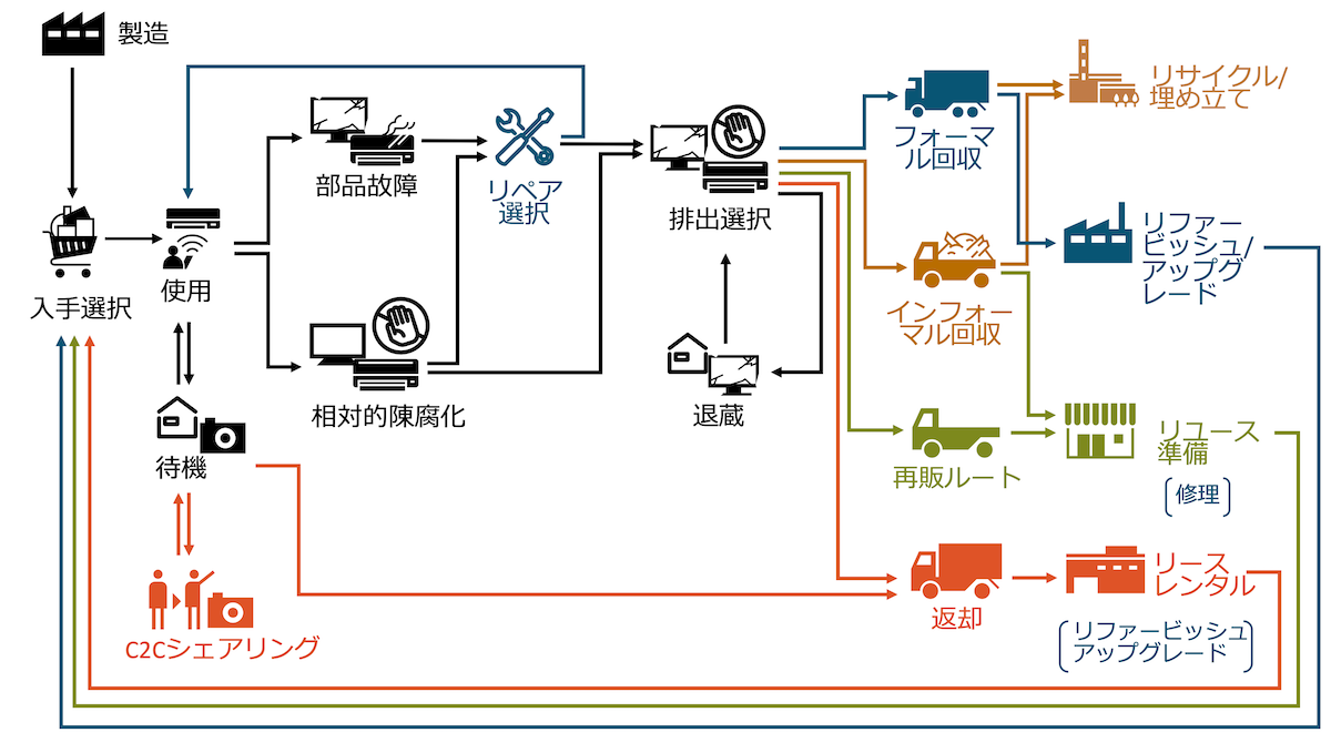 近年、環境負荷と廃棄物発生を低減し、素材や製品の価値を有効活用するサーキュラーエコノミー(循環経済)の取り組みが国内外において注目されています。また、近年、脱炭素化(カーボンニュートラル)に向けた対策が加速しており、サーキュラーエコノミーの取り組みにも脱炭素化への貢献が期待されています。こうした中で、消費者が使用するさまざまな耐久消費財(家電製品、衣類、自動車など)についても、シェアリング、リユース、リペアなど、サーキュラーエコノミー施策の導入が模索されています。
