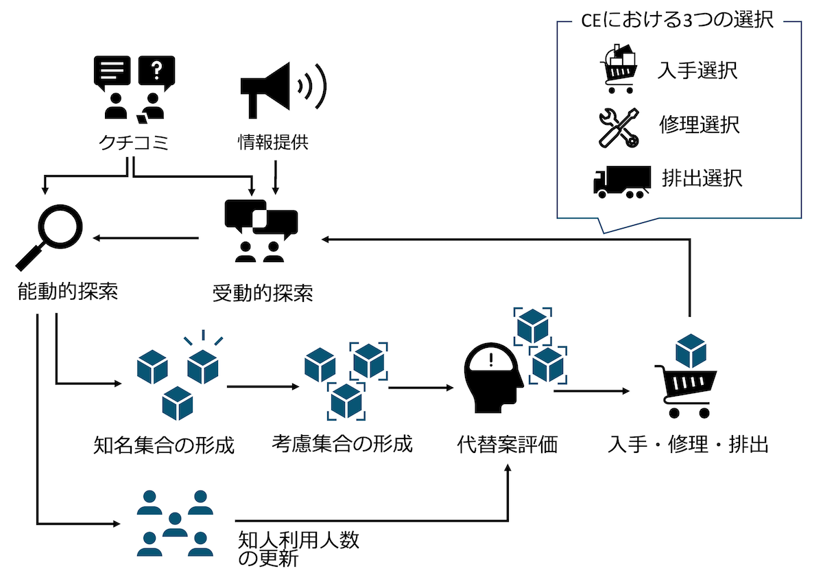 本手法では、個々の消費者の意思決定プロセスと消費者どうしの相互作用をコンピュータ上に再現することで、次のような消費者行動の特徴を踏まえた分析を行います(図2)。これにより、サーキュラーエコノミーの取り組みを普及する価格、広告、サービス改善などの促進策の効果を、消費者行動に関する理論と入手可能なデータに基づき推計することを可能としました。
