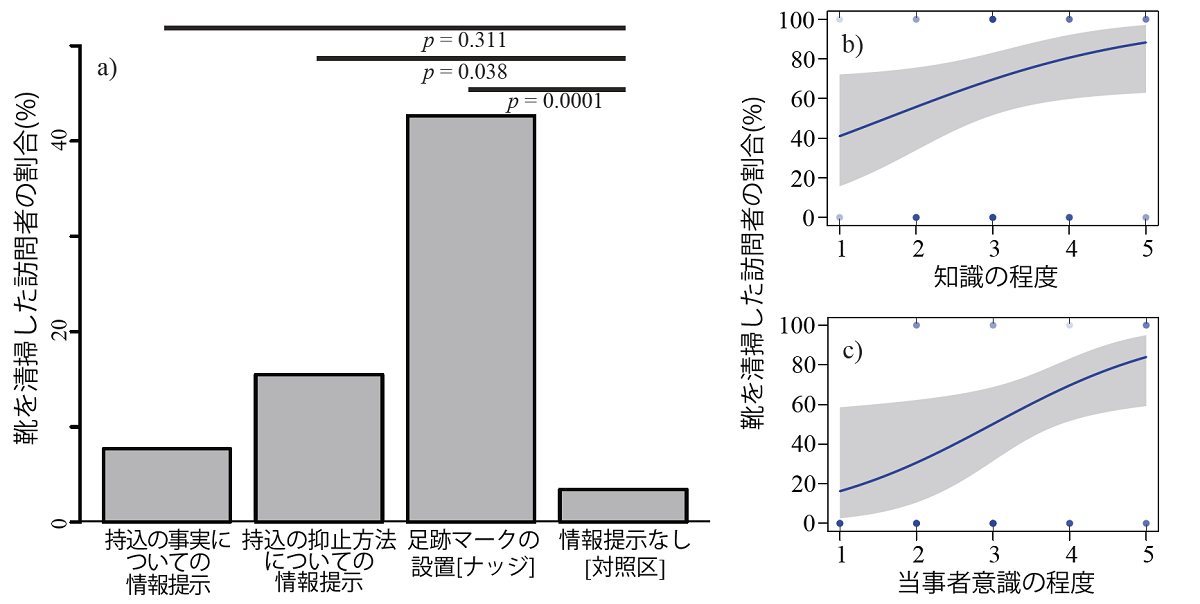 行動が観察できアンケートの回答が有効であった344人の訪問者について分析した結果(図2a)、④情報提示を行わない場合に比べ、①足跡マークを設置した場合には、約21倍、③持込抑止方法を提示した場合には約5倍の訪問者が登山口で靴を清掃しやすくなっていました(オッズ比)。さらに、①足跡マークを設置した場合では、外来植物の持込に対する知識(図2b)および当事者意識の程度(図2c)が高いほど、靴を清掃する割合が大幅に増加しました。具体的には、当事者意識が最低レベルであった場合に靴を清掃した割合は16.2%程度であったのに対して、当事者意識が最高レベルであった場合には、83.9%でした。同様に知識が最低レベルの場合に靴を清掃した割合は41.0%であったのに対し、最高レベルの場合には、88.3%となりました。持込を抑止する方法を提示した場合についても、知識が高いほど、清掃する割合が増加しました。