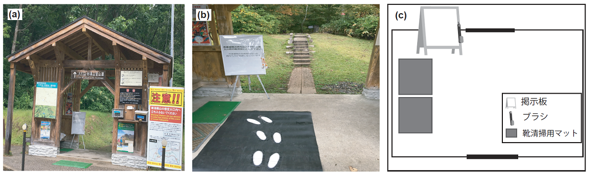 個人の行動が必要な生物多様性の保全上の課題の例として、自然地域での歩行者による意図しない外来生物の持込があります。特に外来植物については、歩行者に衣類や靴にタネが付着することで意図せず持ち込んでしまうことがあり、外来植物の自然地域への侵入の主な経路の一つとなっています。また、歩行者は車両よりも自然地域の奥深くに入り込むこともできます。これらの観点から、国立公園などの生物多様性・生態系が豊かな地域では歩行者の立ち入りを制限することが望まれますが、そのような場所は登山やハイキングを含む質の高い自然体験の場でもあり、歩行者の立ち入りを完全に制限ですることはできません。このため、訪問者を受け入れつつ、外来植物の侵入を防ぐ対策が必要になります。本研究グループによるこれまでの研究から、訪問者の外来植物に対する知識や問題意識の程度は高い一方で、その知識や問題意識が外来植物の持込防止対策としての有効性が期待される訪問前の靴の清掃に繋がっていない、つまり知識や問題意識を持つだけでは、外来植物の意図しない持込を防ぐことは難しいことを明らかにしてきました(2021年9月7日プレスリリース (外部サイトに接続します))。しかし、実際に登山口で靴の清掃を効果的に促す行動変容の方策や、その方策の効果を左右する個人の特性に関する知見はありませんでした。そこで、個人が持っている知識や問題意識を活かすための、「気づき」が必要ではないかと考え、ブラシとマットからなる靴の清掃ツールの設置と併せて、その設置場所まで足跡マークを地面に描き誘導することや、事前に靴を清掃することが外来植物の持込抑止につながることを記した情報提示などの有効性を評価しました。