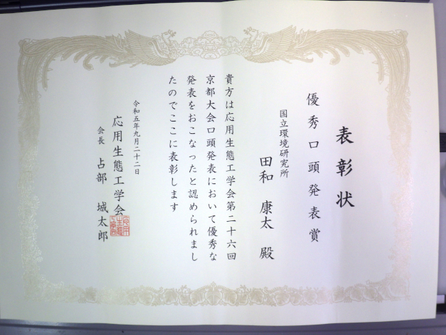 田和 康太 特別研究員、西廣 淳 副センター長が応用生態工学会第26回京都大会優秀口頭発表賞を受賞