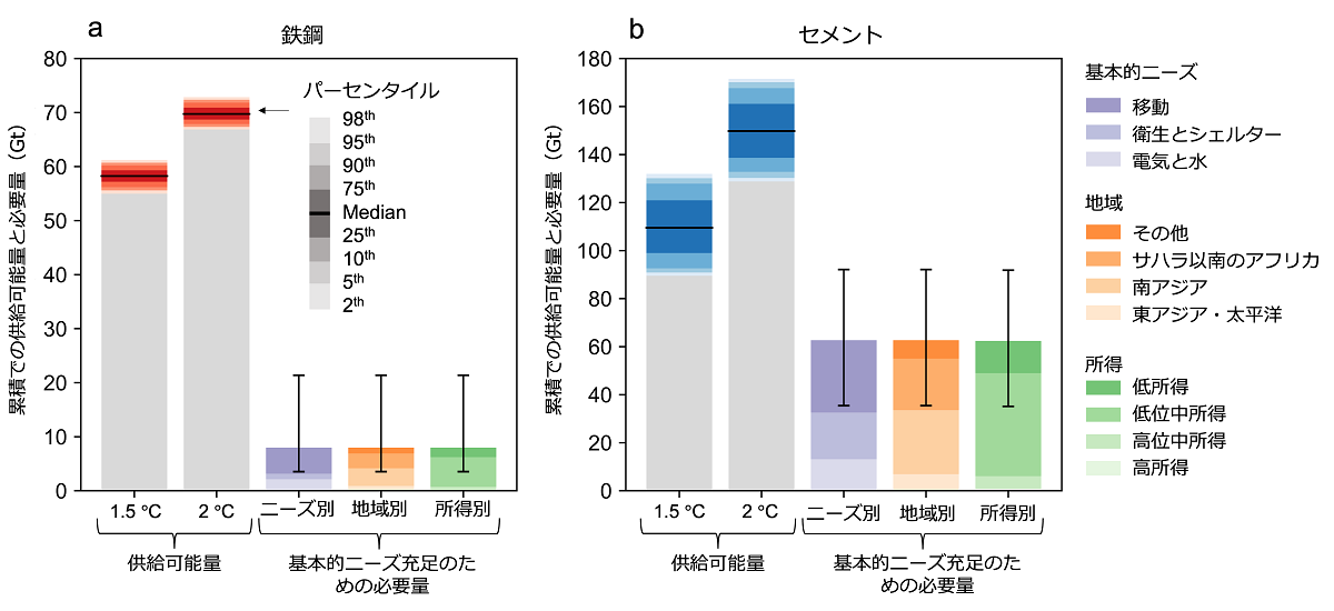 このような資源効率性を高める取り組みは、特に日本を含む高所得国に強く求められます。これは、高所得国では既に大量の社会基盤材料が製品やインフラとして社会に溜め込まれている一方、多くの低所得国では基本的ニーズを満たすために必要な量が依然として確保されていないためです。その具体的な規模を検証するため、当研究グループは全世界の基本的ニーズ(電気・水・衛生・シェルター・移動へのアクセス)を満たすための鉄鋼・セメントの必要量注釈6を、炭素予算内での供給可能量と比較しました。