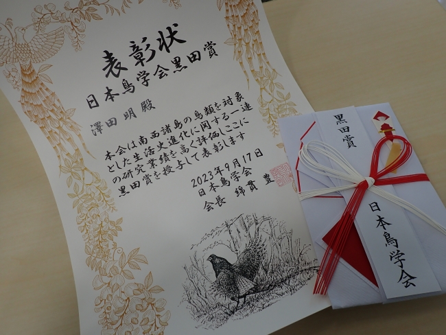 「日本の鳥類学の発展に貢献した黒田家の功績を記念して、鳥類学で優れた業績を挙げ、これからの日本の鳥類学を担う鳥学会の若手会員」として2023年度の日本鳥学会黒田賞をいただきました。私の行っている研究は、島の鳥類標識個体群の長期研究であり、非常に地道なスタイルの研究です。その中で、配偶者選択という中心テーマに対して膨大な基礎データをもとに様々な側面から行ってきたさまざまな研究に対して評価をいただきました。また、授賞理由には調査地でのアウトリーチ活動への積極性も挙げていただきました。研究成果の還元は研究者の重要な務めであるにもかかわらず、論文や学会発表には現れにくい部分です。そのため、今回の受賞でこうした活動に対しても評価をいただけたことを大変嬉しく思います。今後も地道な基礎研究と成果発信に力を入れ、地域から信頼される研究者を目指して調査と研究を続けて参ります。