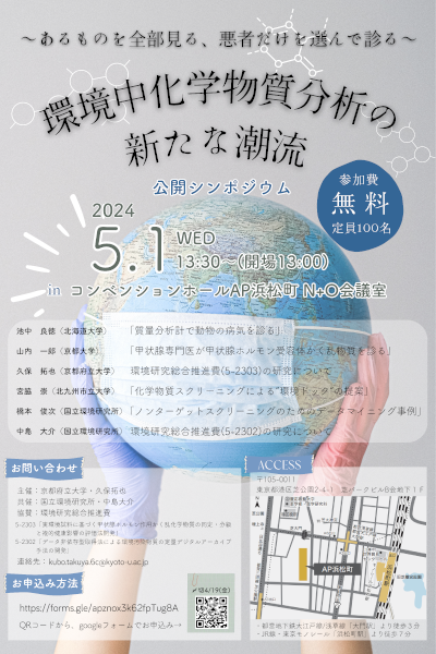 このシンポジウムは、環境研究総合推進費【5-2302】「データ非依存型取得法による環境汚染物質の定量デジタルアーカイブ手法の開発」と【5-2303】「実環境試料に基づく甲状腺ホルモン作用かく乱化学物質の同定・分級と複合的健康影響の評価法開発」により実施されます。