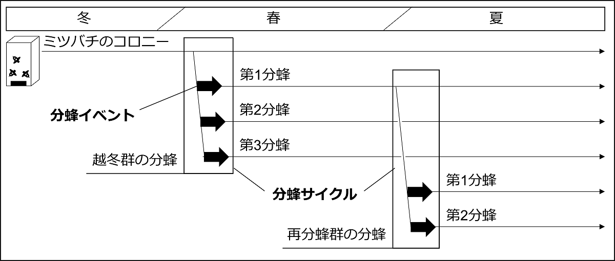 全球規模で生じている気温上昇により多くの動物の行動が変化しています。ミツバチでは、特定の花に訪れる回数が多くなることと、越冬後の活動開始が早まることが報告されています。繁殖行動である「分蜂」においても、春に多く観察され、季節性があるため、気温上昇に伴って変化している可能性がありますが、これまで長期的なデータを取りまとめた研究はありませんでした。分蜂は、女王が多数のワーカー(働きバチ)と共に巣を離れて新たに営巣する行動です。一つのコロニー(蜂群)から次世代の女王が複数羽化した場合、分蜂は複数回生じることがあります。本研究では、各分蜂を「分蜂イベント」、一連の分蜂イベントを「分蜂サイクル」と定義します(図2)。