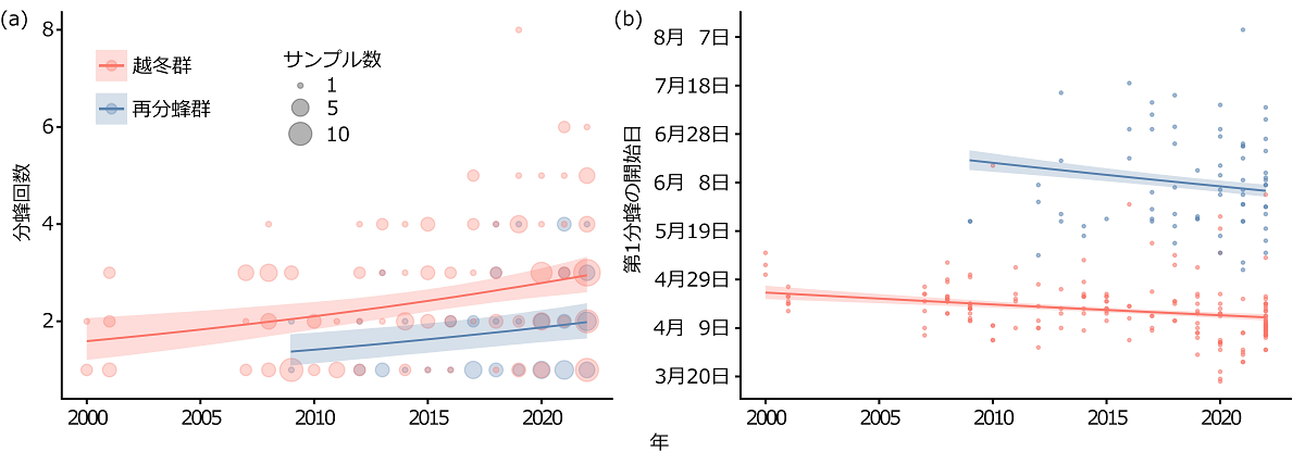 筆者らは、ニホンミツバチ養蜂者から過去の分蜂回数の記録を収集し、越冬群(越冬後、その年最初の分蜂サイクルを行ったコロニー)と再分蜂群(その年2回目の分蜂サイクルを行ったコロニー)を区別したうえで、分蜂回数(分蜂サイクルあたりの分蜂イベント数)および分蜂開始日の長期的な変化を解析しました(図2)。また、分蜂を開始した月によって分蜂回数が変化するかを検証し、分蜂回数の長期的な変化を近年の気温上昇の視点から説明する仮説を提示しました。
