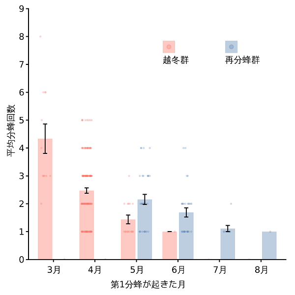 253例のニホンミツバチの分蜂サイクルを解析した結果、2000年から2022年の間、分蜂回数は緩やかに増加し(年間約1.03倍,図3a)、越冬群は再分蜂群よりも多く分蜂したことが示されました。また、解析した23年間で、分蜂開始日は早まったと推定されました(平均して年間約0.44日,図3b)。さらに、第1分蜂が生じた月と分蜂回数の関係から、越冬群と再分蜂群ともに、その年の早い時期に分蜂を開始したほうが多く分蜂することが示されました(図4)。特に、3月に分蜂を開始した越冬群の分蜂回数は、4月以降に分蜂を開始した場合よりも多いことがわかりました。これらのことから、分蜂開始日が早まったことで、ニホンミツバチの分蜂回数が増加した可能性が考えられます。日本において冬から早春にかけての気温が近年上昇していることを考慮すると、採餌ができない低温期が短縮され、多くのワーカーが死亡することなく分蜂期を迎えることが分蜂回数の増加の要因である可能性があります。しかし、気温の上昇と分蜂回数の増加の因果関係を明らかにするためにはさらなる研究が必要です。