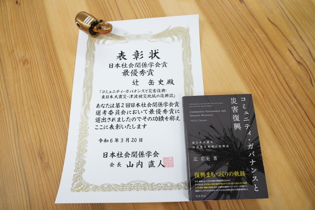 本賞の対象は辻岳史著『コミュニティ・ガバナンスと災害復興:東日本大震災・津波被災地域の復興誌』晃洋書房(2023年2月刊行)です。本書は東日本大震災において甚大な津波被害を受けた3つの地域(宮城県女川町・東松島市・名取市)における災害復興過程の事例比較分析をもとに、被災地域において構築されるコミュニティレベルのガバナンスが災害復興に果たす役割を論じたものです。本書は、政治過程としての災害復興を通時的に分析する概念としては、ソーシャル・キャピタル(社会関係資本)よりもガバナンスに利があると主張しています。日本社会関係学会はソーシャル・キャピタル研究に力を入れている学会であるため、受賞の連絡をうけたときは大変驚きました。選考にあたられた本学会賞選考委員会の皆様、そして被災後の大変な状況のなか、調査研究に快くご協力・ご助力いただいた女川町・東松島市・名取市のすべての皆様に、厚く御礼申し上げます。
