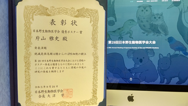 第29回野⽣動物医学会⼤会において、優秀ポスター賞を受賞しました。細胞は感染症や汚染物質に対する感受性評価に利用することができます。本受賞は、保護団体の⽅々等のご協⼒により取得した絶滅の危機に瀕する鳥類の体細胞の有用性を向上させ、受賞に至りました。本研究で樹立したiPS細胞から神経細胞や肝臓細胞を作製することが可能であり、高度な感染症や汚染物質に対する感受性評価が可能になります。本受賞を励みに、細胞を含め様々な⼿法を⽤いて、⽣物多様性の保全に貢献できる様、精進を重ねて参ります。
