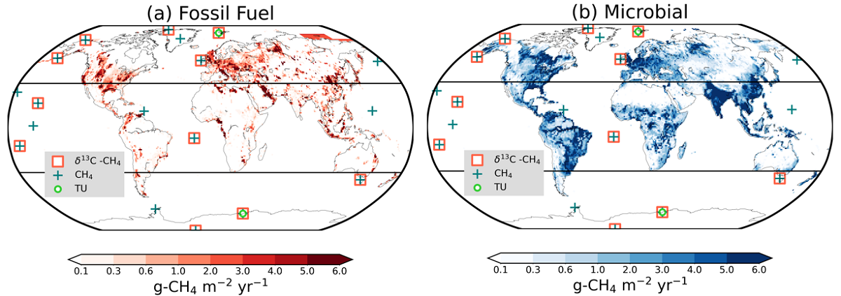 国立研究開発法人海洋研究開発機構(理事長 大和 裕幸、以下「JAMSTEC」という。)北極環境変動総合研究センターのナヴィーン・チャンドラ ポストドクトラル研究員および地球表層システム研究センターのプラビール・パトラ上席研究員は、東北大学、気象庁気象研究所、国際応用システム分析研究所、国立環境研究所、国立極地研究所、コロラド大学、ユトレヒト大学の研究者と共同で、大気中メタン濃度の長期および短期的な変化に対して化石燃料および微生物起源のメタン放出がそれぞれどのように影響したかについて、放出インベントリ(※2)や高精度のメタン濃度および安定炭素同位体比の大気観測データと全球大気化学輸送モデルとを組み合わせて解析する手法を新たに開発しました。