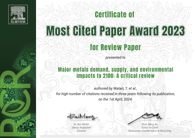 Resources, Conservation & Recycling誌において2021年に発表された論文から、2021年~2023年の3年間で最も引用された論文の一つとして、「2023 Most Cited Paper Award」を受賞しました。 当該論文では、日常生活に不可欠な鉄鋼、アルミニウム、銅、亜鉛、鉛、ニッケルの6つの主要金属資源に焦点を当て、世界的な将来需給に関する包括的な調査を行いました。これら金属の需要と供給が現在から2030年、2050年、そして2100年までの期間にどのように変化する可能性があるかをまとめたデータベースは、学術論文だけでなく、政策文書や産業レポートなど、さまざまな分野で活用されています。 本受賞を励みに、今後も資源の持続可能性に関する研究に精進してまいります。