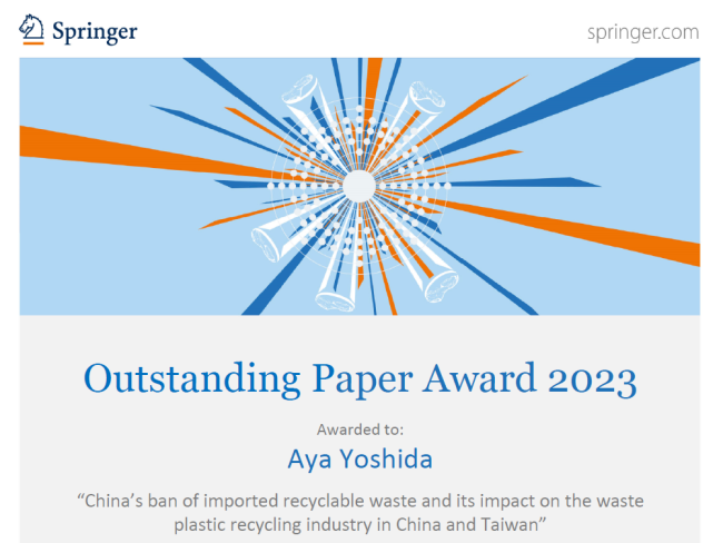 JMCWM Outstanding Paper Award 2023は、Journal of Material Cycles and Waste Management(Vol.22-24, 2020~2022)に掲載された541編の原著論文および総説論文の中から、編集委員の審査と被引用数に基づいて選ばれます。 初めてノミネートの連絡を受けた時は、大変驚きましたが、この素晴らしい賞を受けることができて本当に光栄です。この研究は、2017年末の中国の廃棄物(再生資源)輸入禁止がプラスチックリサイクル産業に与えた影響に焦点を当て、中国および台湾の政府・公的組織へのインタビュー調査を通じてその影響を明らかにしました。 この研究を支援してくださったすべての方々に心から感謝申し上げます。