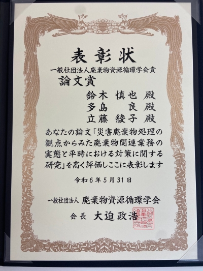 受賞対象: 災害廃棄物処理の観点からみた廃棄物関連業務の実態と平時における対策に関する研究,廃棄物資源循環学会論文誌, 34, 93-105, 2023