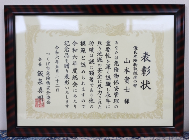 山本 貴士 主幹研究員がつくば市危険物安全協会より令和6年度つくば市危険物安全協会表彰(優良危険物取扱者)を受賞