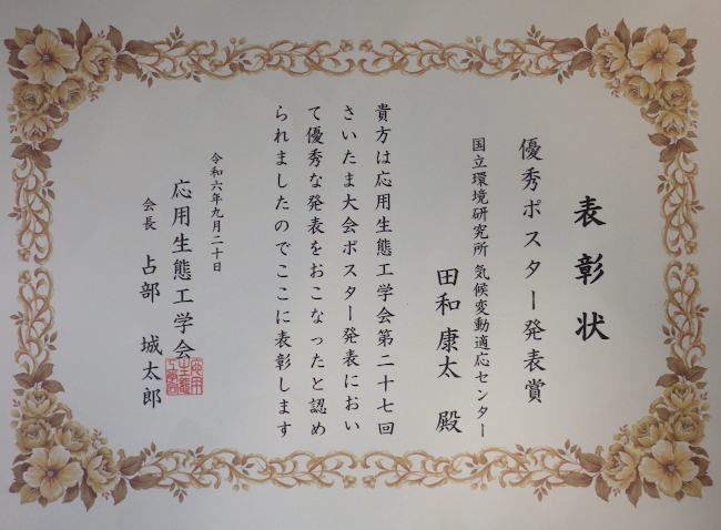 田和 康太 特別研究員らが応用生態工学会第27回さいたま大会 優秀ポスター発表賞を受賞