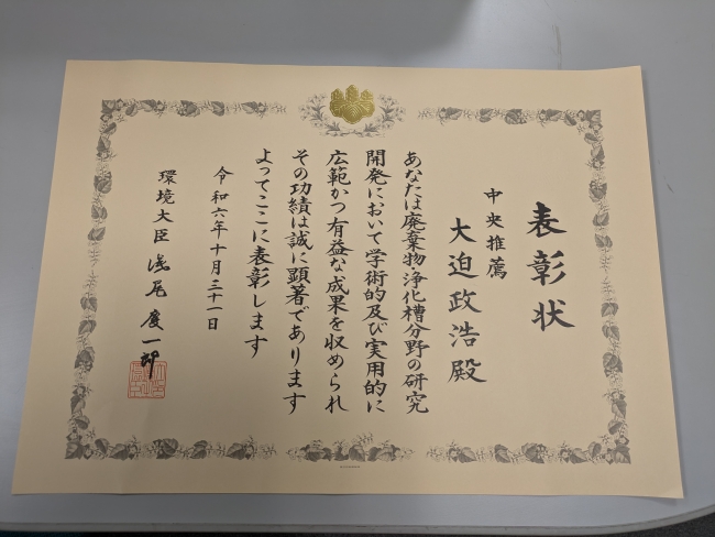 大迫 政浩 フェローが環境省より令和6年度環境⼤⾂表彰を受賞