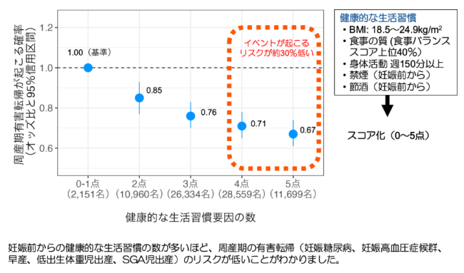 妊娠前から健康的な生活習慣を多く実践しているほど、母子ともに将来の生活習慣病リスクに関連する周産期の有害転帰の発生リスクが低いことがわかりました。