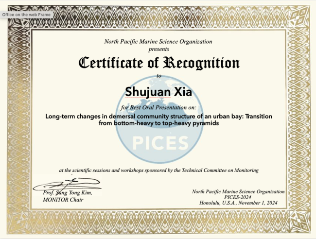 XIA Shujuan 特別研究員が北太平洋海洋科学機関よりBest Oral Presentation Awardを受賞