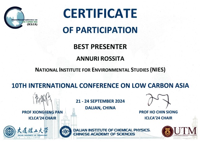 ROSSITA Annuri 特別研究員が 10th International Conference on Low Carbon Asia より Best Presenter を受賞